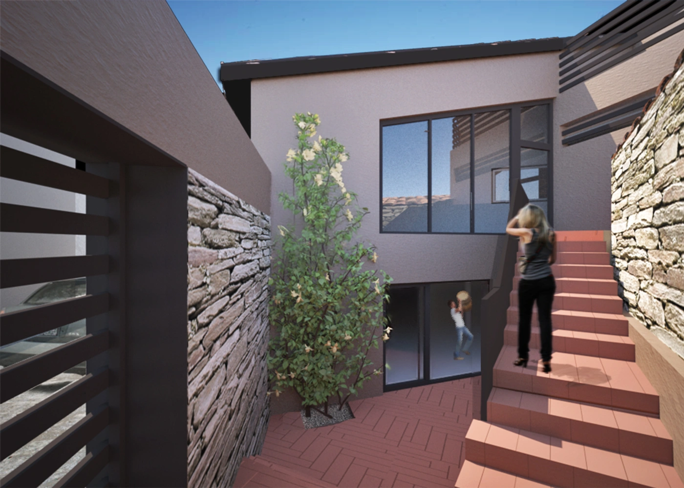 Se mantienen y sanean los muros de piedra y se construye todo el nuevo edificio dentro de éstos, con una estructura metálica independiente en color marrón oscuro. Se utilizan colores terrosos que combinados con la piedra y la cerámica de la teja y del pavimento del patio se mimetizan con el entorno, dado que son los materiales utilizados mayoritariamente en las construcciones del municipio.