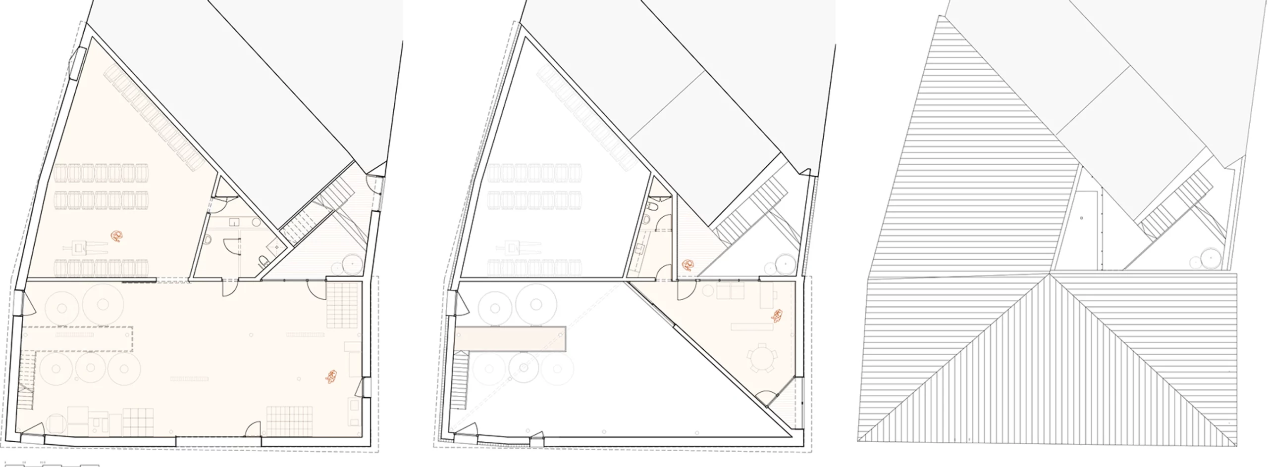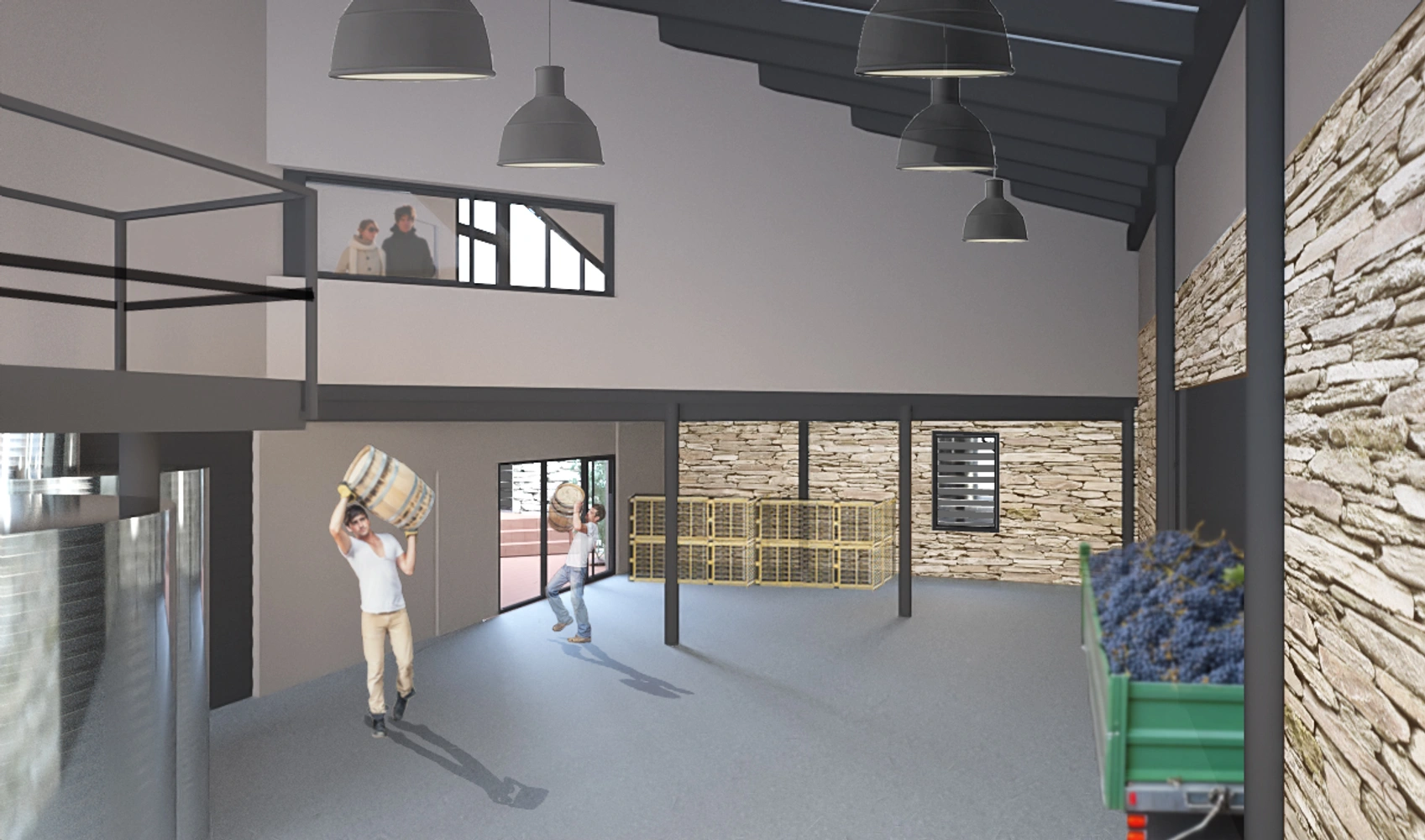 Se proyecta la nave principal de vinificación y crianza en planta baja con gran altura, y se incorpora un pequeño altillo con función de oficina y sala de catas, que dispone de entrada independiente por un patio interior. El altillo tiene vistas a la nave principal de vinificación y a la esquina a través de un pequeño porche, que enfoca las vistas a la carretera, punto de acceso al municipio.
